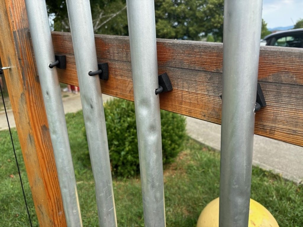 Rickey Absher made this Corinthian bells B scale chime set from 2-inch aluminum and used #18 black nylon cord for support. Purchased from Amazon, he used a small tube as the axle for the striker. There was sufficient tubing to make four axels.